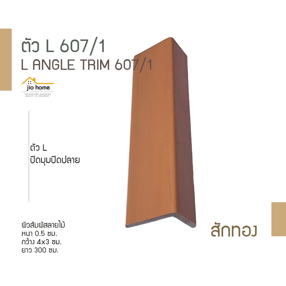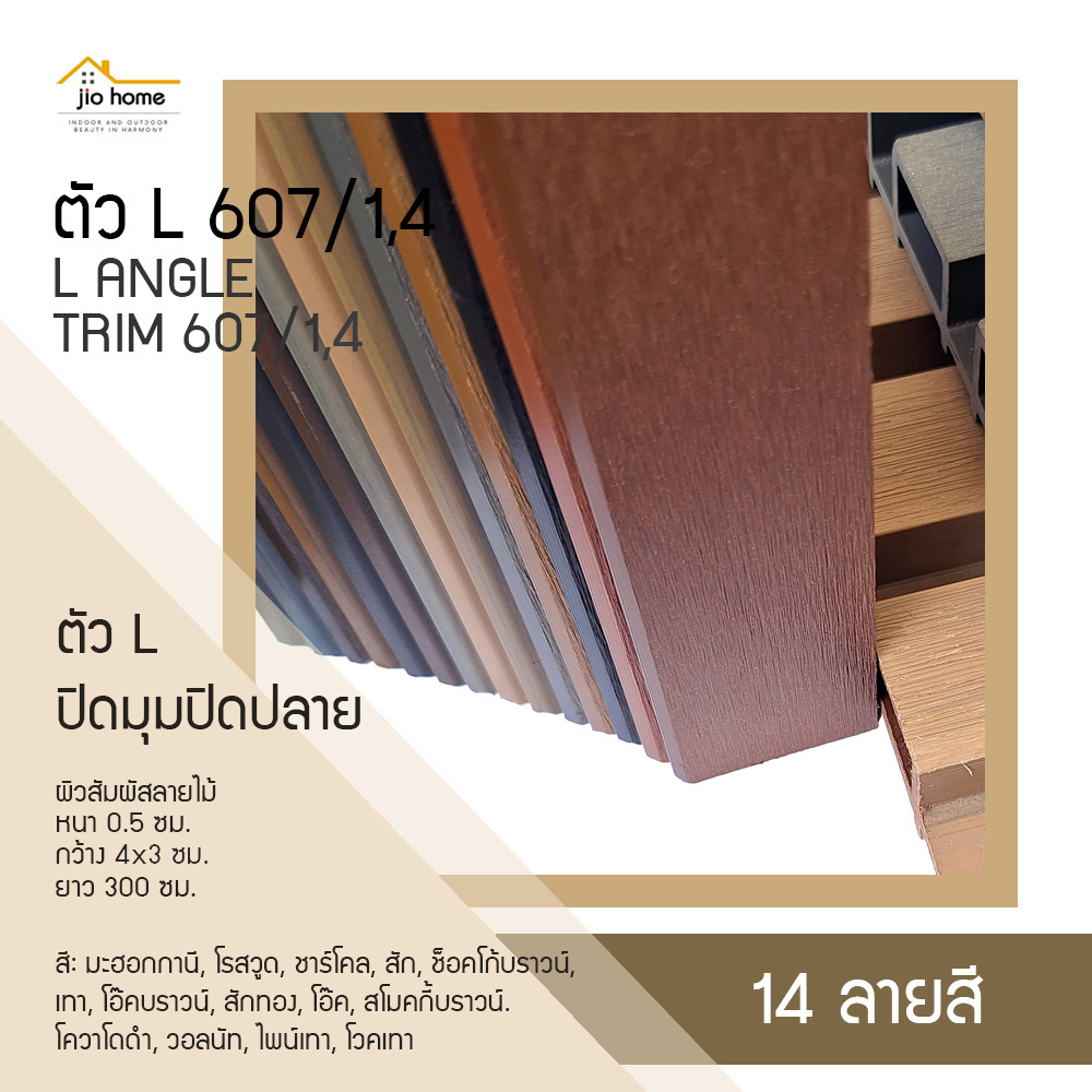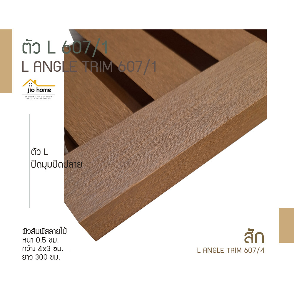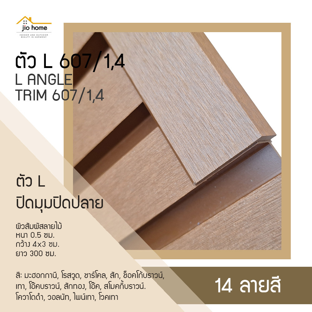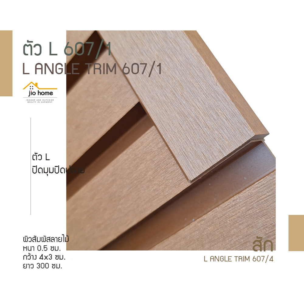 รุ่น 607 มีให้เลือกทั้งแบบ ตัว L ปิดมุมปิดปลาย และ ตัวครอบฉากปิดมุม (Angle) เพื่อรองรับงานติดตั้งที่หลากหลาย ขนาดมาตรฐาน หนา 0.5 ซม. กว้าง 4×3 ซม. / 4×4 ซม. ยาว 300 ซม. และมีให้เลือกมากถึง 14 เฉดสี แบบเดียวกับซีรีส์ไม้เทียมและผนังระแนงภายนอกของ Jio Home เพื่อให้งานตกแต่งของคุณดูสวยกลมกลืนในทุกดีเทล — Jio Home ความงามที่ลงตัวในทุกมุมมอง ทั้งภายในและภายนอกบ้าน